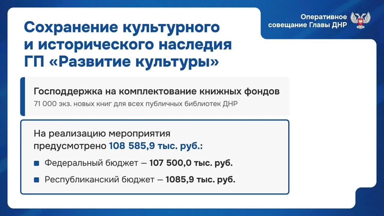 В рамках национального проекта «Семья» реализуем 12 мероприятий: оснащаем 2 республиканских театра в Донецке, создаём 6 модельных библиотек, строим школу духовой музыки, модернизируем музей Седова в Новоазовском округе и 2 клуба в Волновахском округе.