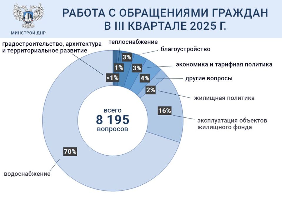 За третий квартал текущего года Министерством строительства, архитектуры и жилищно-коммунального хозяйства ДНР принято более 7,9 тысяч обращений граждан, среди которых большая часть (5968...