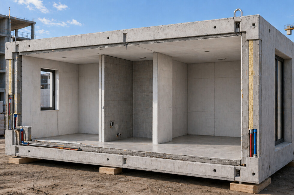 Блоки типа «лежачий стакан» — это монолитно связанные три внутренние стены с потолком и полом, но без наружной стены. Обычно наружную стену производят отдельно и монтируют на заводе или на стройплощадке.