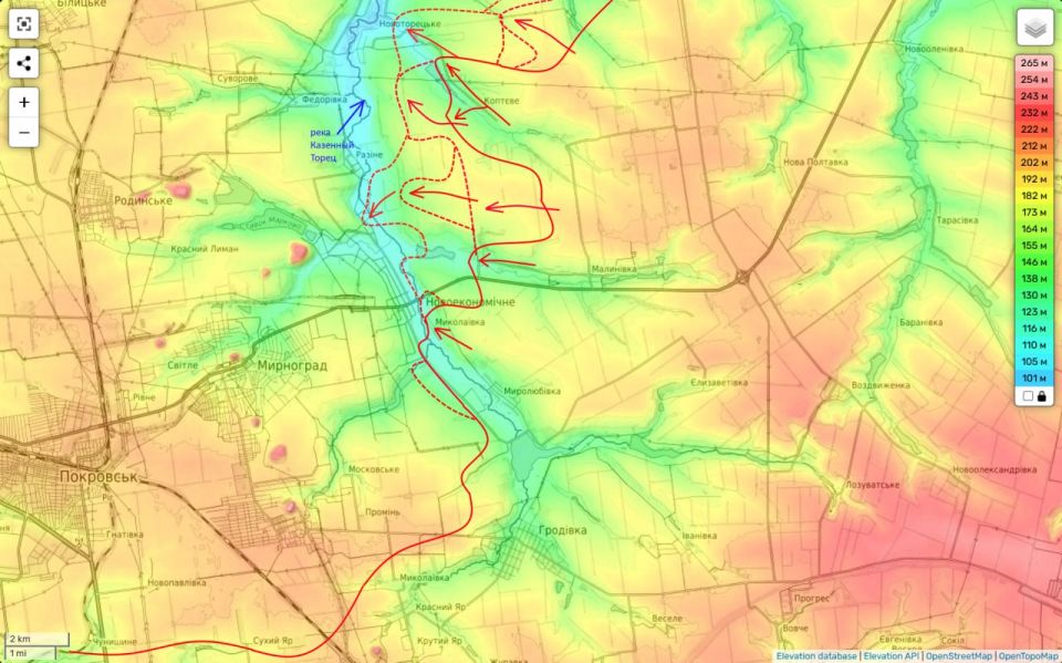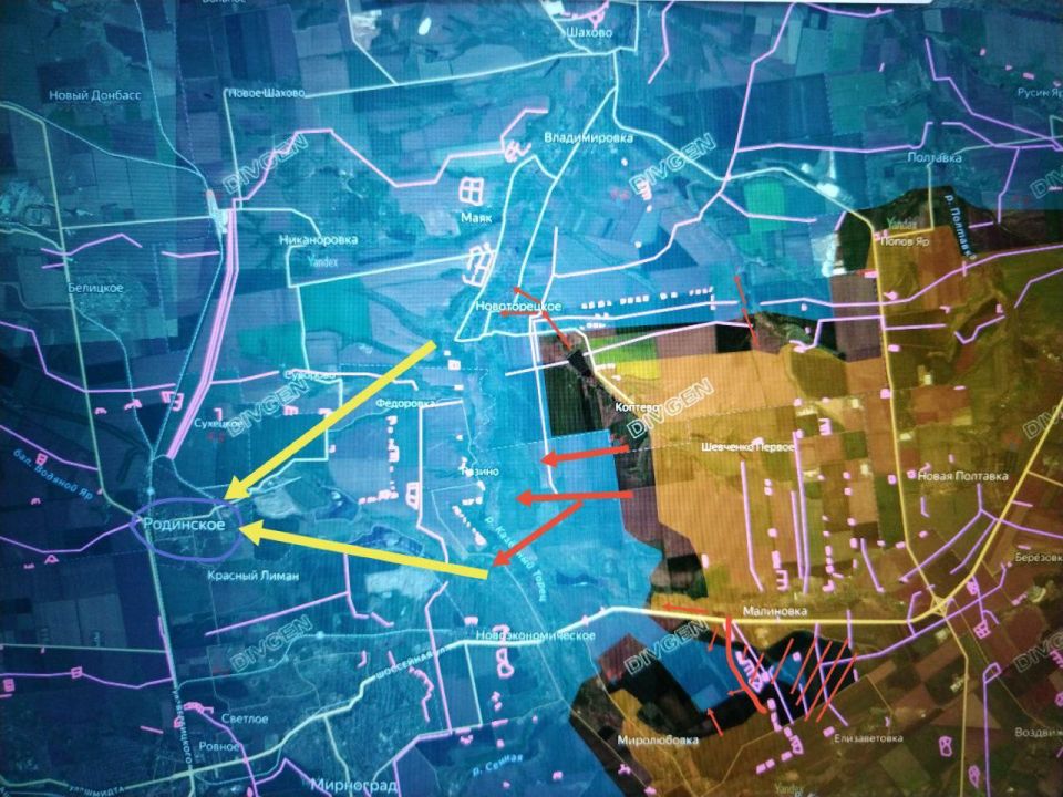 Севернее Красноармейска и Мирнограда российские войска закрепились в застройке в восточной и центральной частях города Родинское, после чего продвинулись в северо-западной части и продолжают штурм.Площадь продвижения: около 2 кв.км.Ожесточенные бои не...