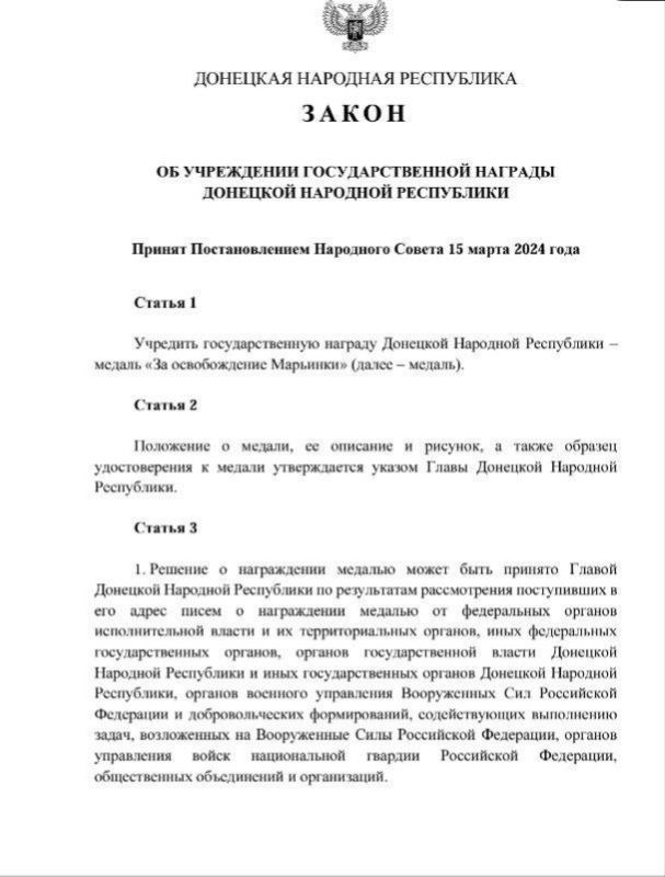 В ДНР учредили награды за освобождение Авдеевки и МарьинкиГлава ДНР Денис Пушилин подписал законы об учреждении двух важнейших региональных наград — «За освобождение Марьинки» и «За освобождение Авдеевки».Эти награды получат наши бойцы, которые на...