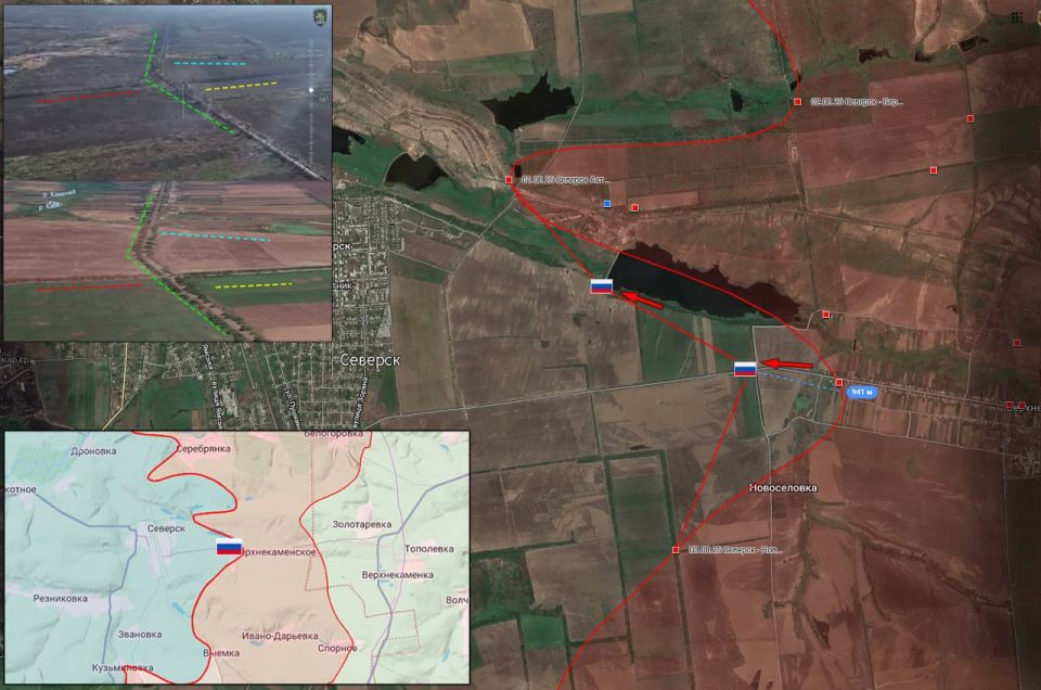 Атака ВС РФ подразделением лёгких мотострелков в направлении Северска. Штурмовая группа выдвигается из Верхнекаменского и направляется к городу под огнём противника.Увеличение зоны контроля ВС РФ на 1 км на восточных подступах к Северску, сообщает...
