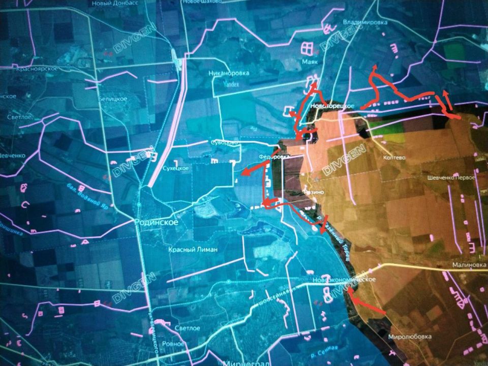 После освобождения Фёдоровки ВС РФ заняли оборонительный рубеж ВСУ в 2 км западнее Разино и ведут бои за посадки (в районе высоты с отм. 191,9) на подступах к шахте "Краснолиманская", за которой расположен н.п. Родинское.