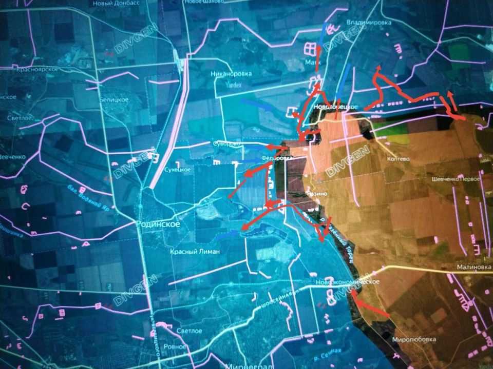 Из района западнее Фёдоровки и Разино наши подразделения атакуют в направлении Суворово, террикона шахты "Краснолиманская" и северо-восточную окраину Красного Лимана севернее ставка Марково.