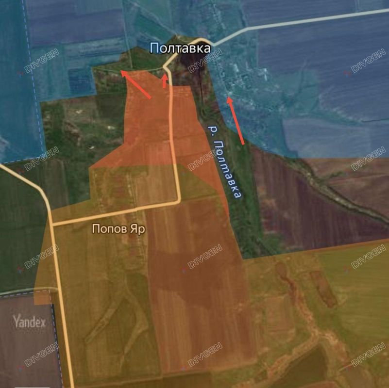 Восточнее Владимировки ВС РФ, наступая со стороны Попова Яра и по восточному берегу р. Полтавка, вошли в н.п. Полтавка, взяли под контроль почти всю западную его половину и продвинулись в южной части восточной половины села.