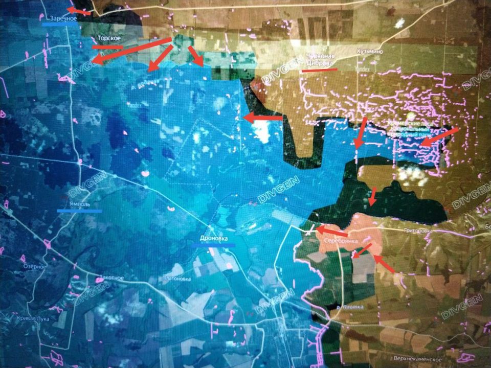 Севернее Серебрянки наши войска продолжают зачистку Кременских лесов и пойменных участков по левому берегу р. Северский Донец и атакуют в лесах в направлении Ямполя юго-западнее Червоной Дибровы. Противник оказывает ожесточённое сопротивление, пытаясь не дать нашим подразделениям закрепиться в районе Водяного Яра, на южной окраине Торского, и выйти к Ямполю, расположенному в тылу Северской группировки ВСУ.