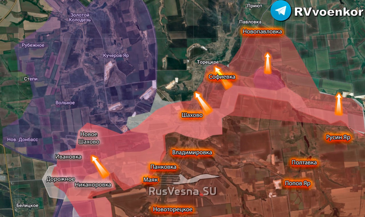 Российские войска ранее переломили контрнаступ ВСУ и после освобождения Владимировки и Шахово взяли под контроль Софиевку и Новопавловку, атакуя в направлении Торецкого и Павловки.