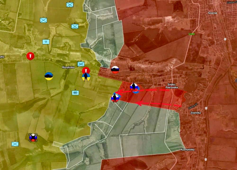 Славянское направление. ВС РФ продвигаются в Резниковке и занимают новые позиции в технических сооружениях южной части посёлка. Увеличение зоны контроля ВС РФ более 1 км.