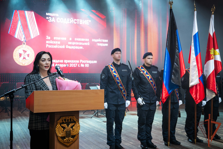 В Донецке начальник Главного управления Росгвардии по Донецкой Народной Республике вручил ведомственную медаль «За содействие» заместителю генерального директора по телевидению и радиовещанию Республиканского медиахолдинга Виктории Мельниковой.