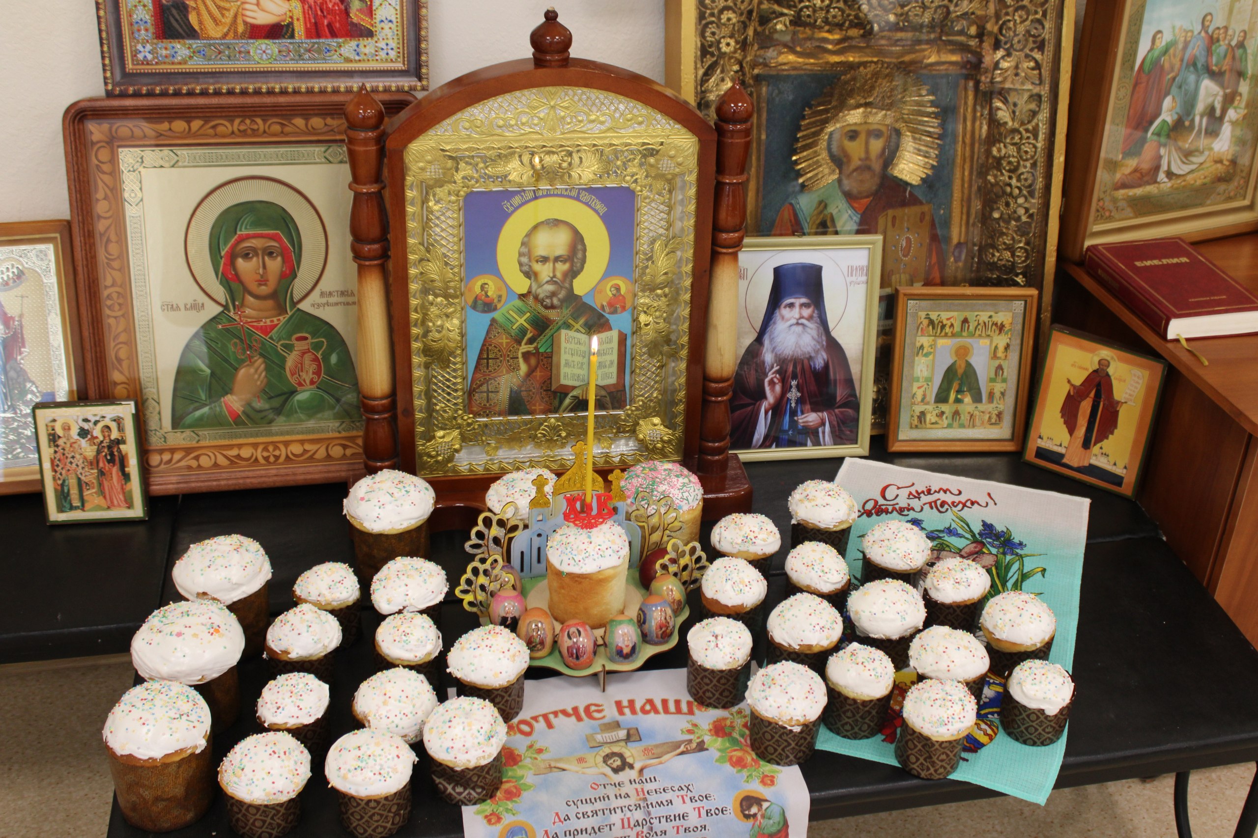 По сложившейся традиции священнослужители освятили куличи и пасхальные яйца, окропили всех присутствующих святой водой и поздравили с великим праздником, пожелав бесконечной радости о Господе, мира, добра, успехов в борьбе со страстями, духовного обновления и просветления.