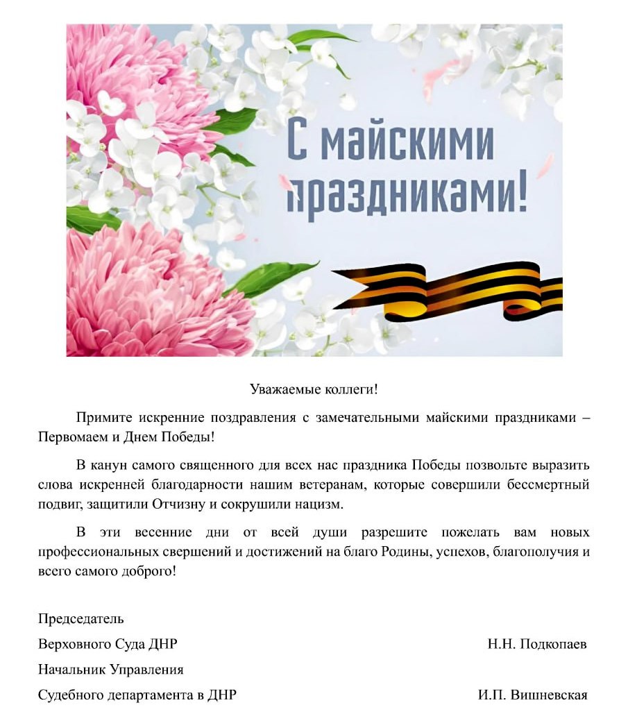 Поздравление с наступающими Праздником Весны и Труда и Днём Победы