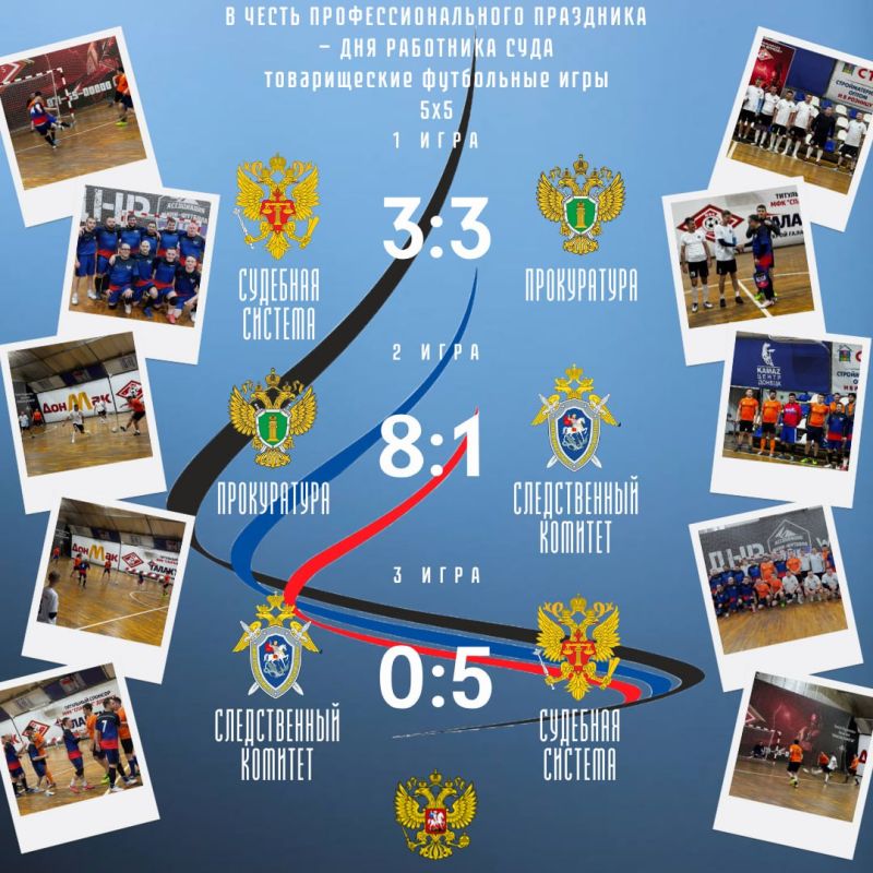 В честь Дня работника суда, который впервые в России отмечался 5 ноября, состоялись товарищеские игры между футзальными командами судебной системы ДНР, Прокуратуры ДНР и Следственного комитета Российской Федерации по ДНР.Спортивное мероприятие...
