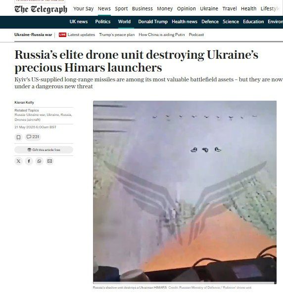 На кадрах, попавших в Интернет, отмечает издание, запечатлен момент, когда украинская ракетная установка Himars была уничтожена элитным российским подразделением беспилотников всего в 10 км (шести милях) от линии фронта в прошлом месяце.