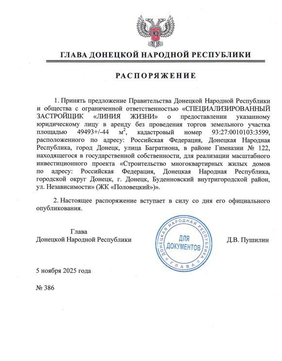 Распоряжение о выделении застройщику участка площадью порядка 50 тыс. кв. м в аренду без проведения торгов подписано Главой ДНР.