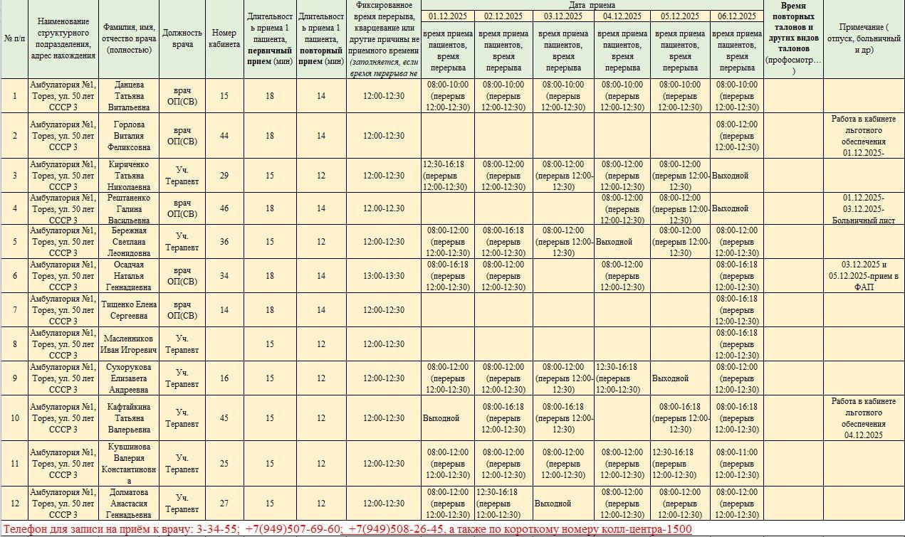 График приёма пациентов врачами амбулаторий ГБУ ДНР "ЦПМСП г. ТОРЕЗА" с 01.12.2025-06.12.2025г