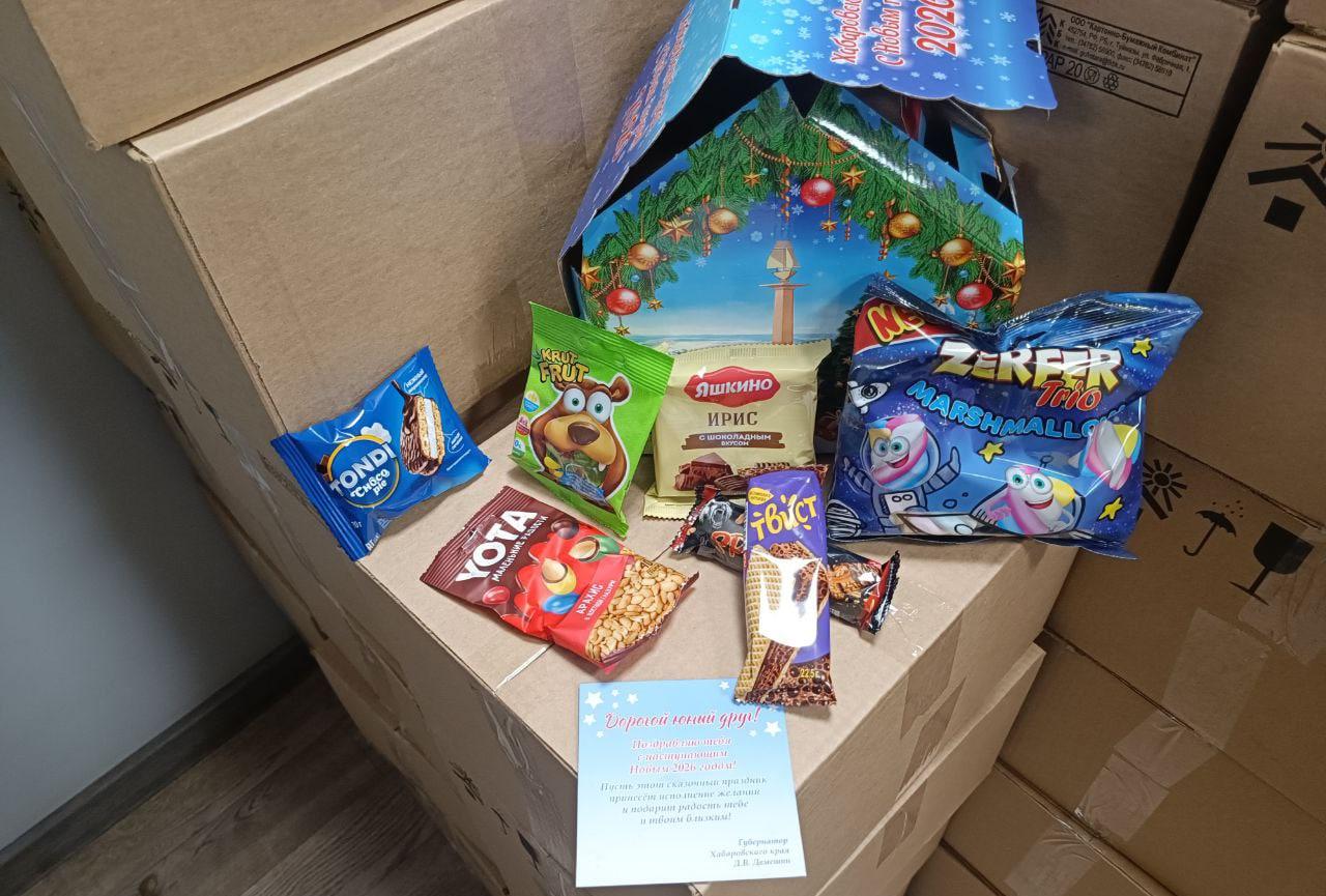 В каждой подарочной упаковке есть поздравление от Губернатора Хабаровского края Дмитрия Демешина.
