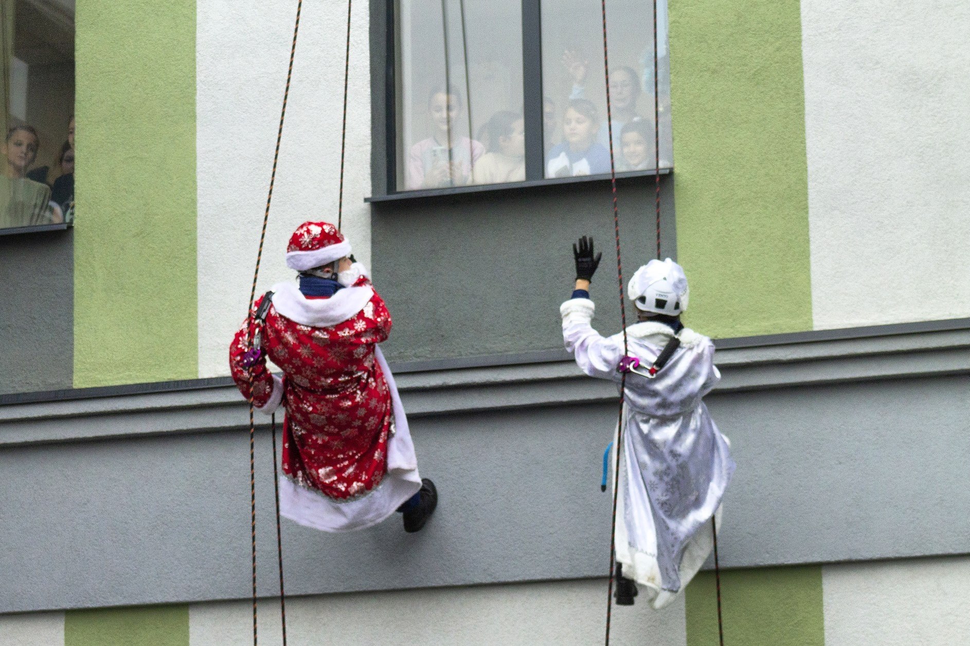 Спасатели в костюмах Дедов Морозов спустились с крыши больницы в Мариуполе
