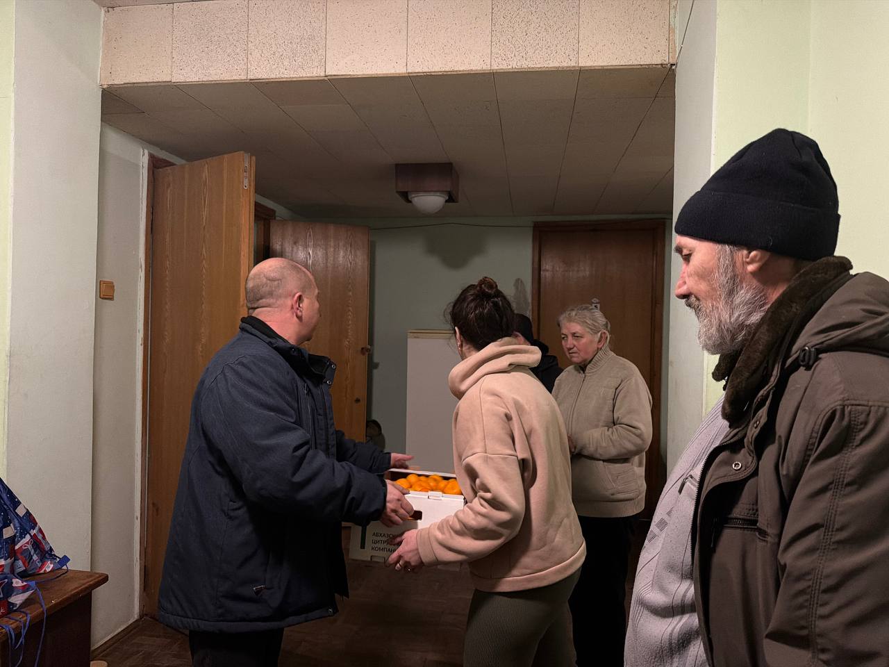 В преддверии новогодних праздников администрация городского округа Иловайск передала подарочные наборы и вкусные новогодние мандарины временно размещенным жителям из прифронтовых районов в пункте временного пребывания на территории Иловайска.