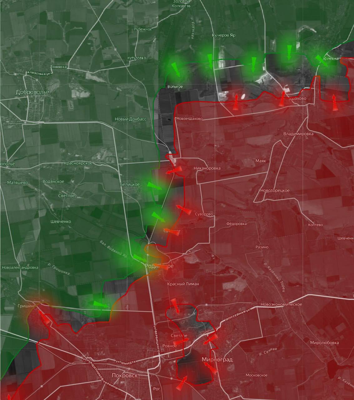«На Покровском направлении ВС РФ продвинулись в Светлом и подняли флаги в центре населенного пункта. Также российские войска развивают атаки дальше на восток к капитальным зданиям у шахты Центральная с целью соединиться с подразделениями в этом районе.