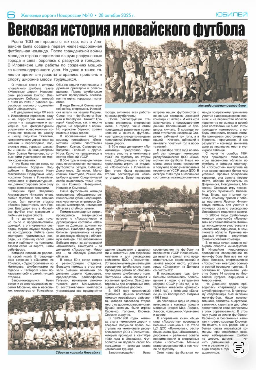 Где прочесть подробную историю?Специальный материал, посвящённый вековому юбилею иловайского футбола, опубликован в газете «Железные дороги Новороссии». Рекомендуем к прочтению всем, кто интересуется историей родного края и спорта!
