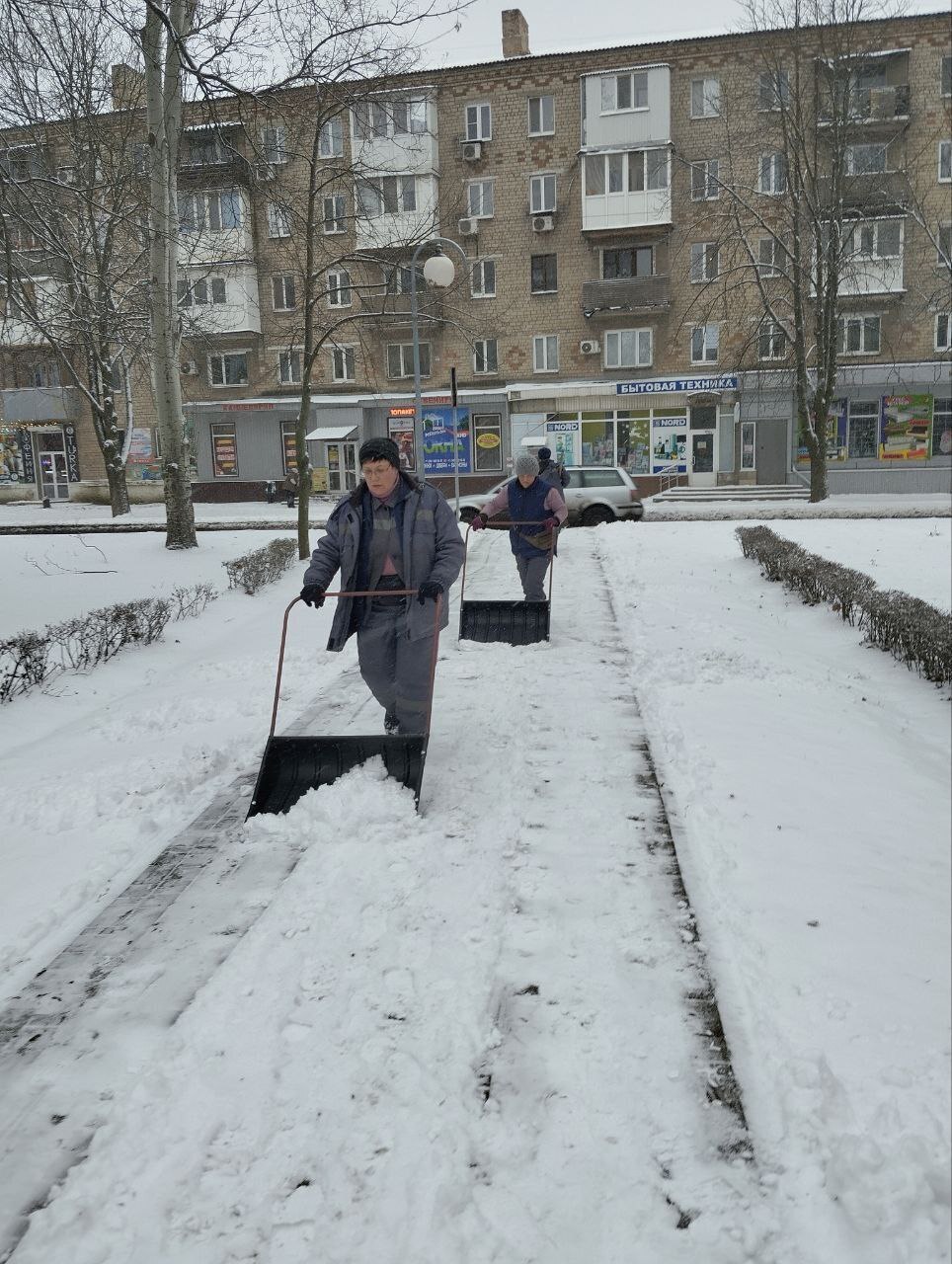 Сотрудники Петровского участка МУП АГОД «Зеленое строительство г. Донецк» выполняют работы по уборке снега на площади Победы и спилу сухих деревьев на улице Углегорской.