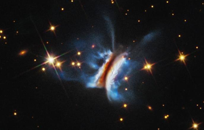 Хаббл наблюдал за звездой IRAS 23077+6707 в созвездии Цефея, которая удалена от нас на 970 световых лет. И заметил, что ее окружает очень плотный и яркий протопланетный диск, который виден с Земли фактически с "торца".