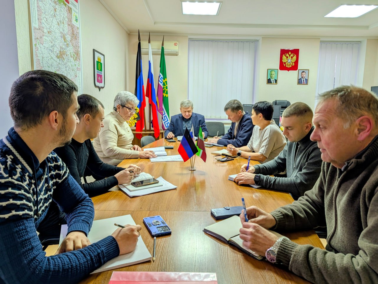 Провел оперативное совещание по текущим вопросам. Обсудили ситуацию в округе, доложили о выполнении данных ранее поручений, определили первостепенные задачи на сегодня, дал соответствующие поручения.