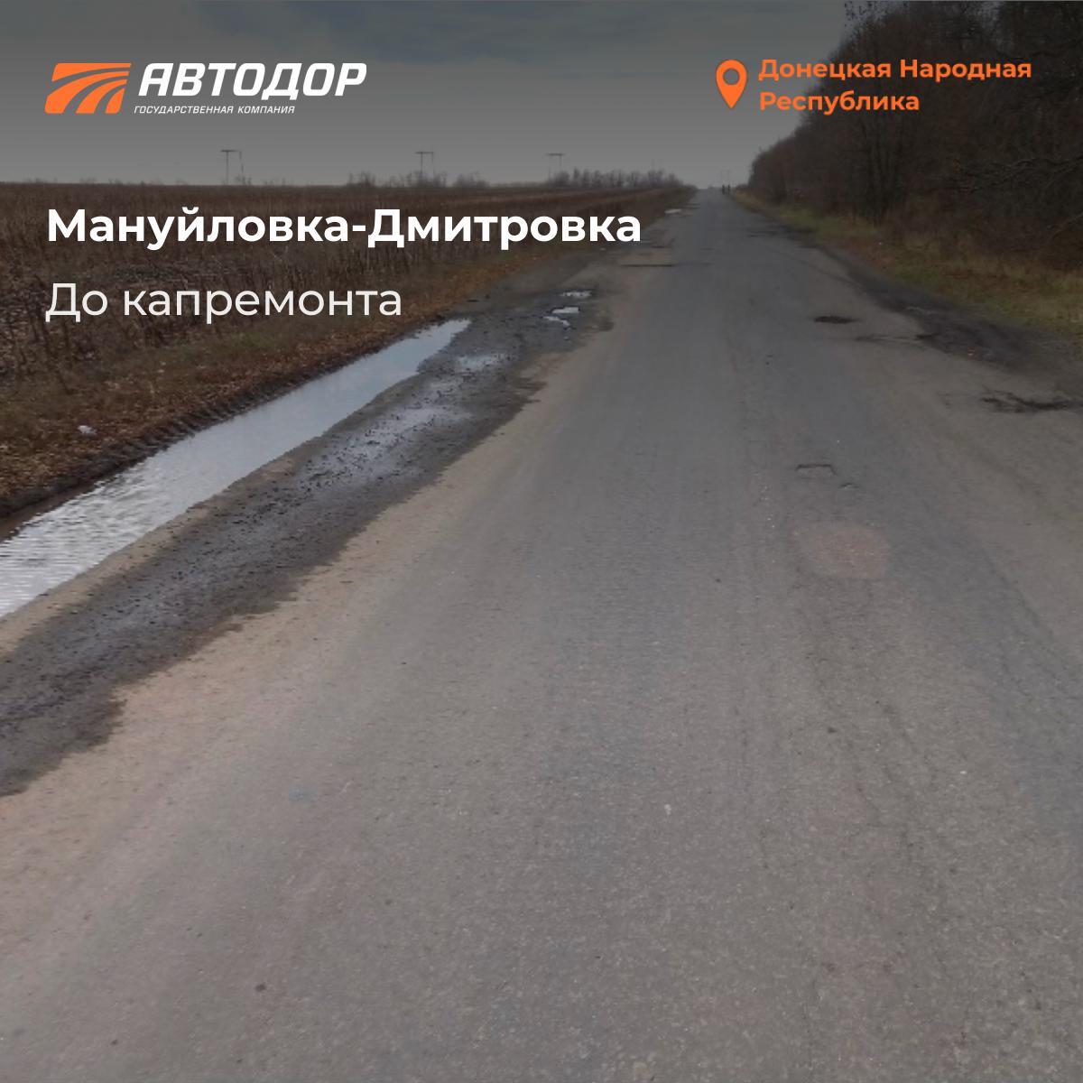 Одним из объектов дорожного восстановления Республики, капитальный ремонт которого выполнен под контролем Госкомпании "Автодор", стала автомобильная дорога Мануйловка - Дмитровка.