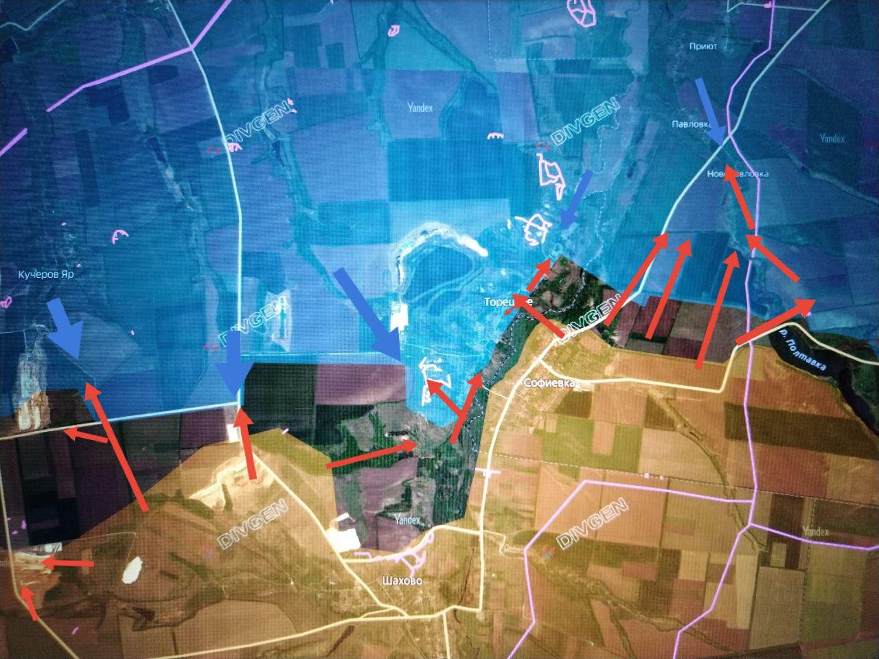— Юго-западнее наши штурмовые группы продолжают выбивать противника из Торецкого, атакуя центральную часть села из южной, а также из северной частей. Часть последней была занята на днях. ВС РФ вышли из Артёмовки (Софиевки) в район местного ДК и продвинулись северо-восточнее до большого опорного пункта на склоне высоты над северной окраиной села.