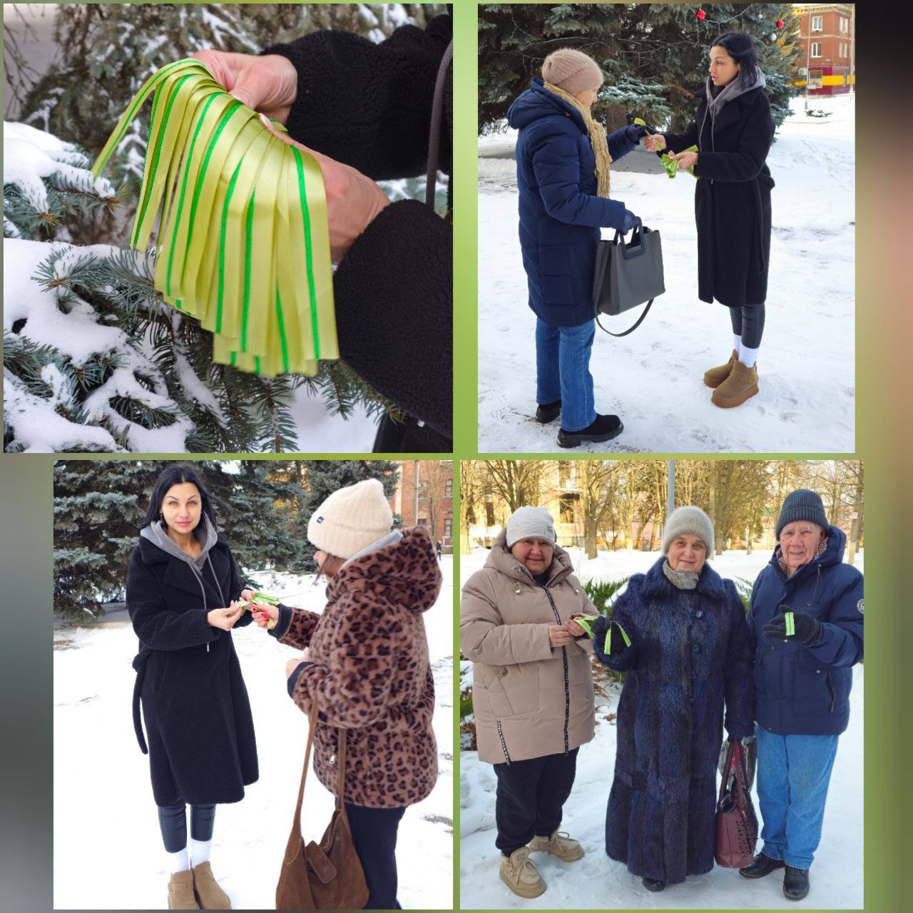 Ленточка Ленинградской Победы - это небольшая полоска ткани двух цветов: оливкового и зелёного. Оливковый цвет ленточки символизирует Победу, а зелёный - цвет жизни. Сотрудники раздавали ленты, цветовая гамма которых повторяет цвет муаровой ленты медали «За оборону Ленинграда». Также они рассказали о её истории, значении и правилах ношения.