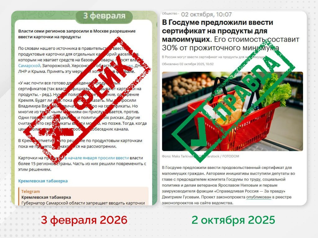 За основу фейка взят реальный законопроект депутата Госдумы Дмитрия Гусева о продовольственных сертификатах для малоимущих по всей России.