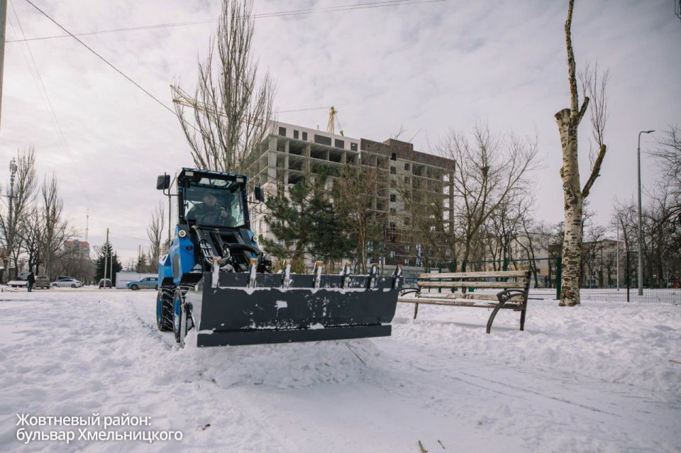 В частности, «Митраксы» расчищают пешеходные зоны на проспекте Победы, улице Пашковского и бульваре Богдана Хмельницкого. Мини-трактор работает на улице Артема.