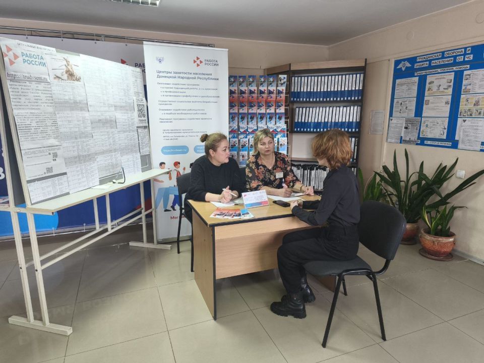 В филиале ГКУ "Служба занятости населения ДНР" в Тельмановском м.о. на своей площадке принимал работодателя МКУ "ЖКХ и благоустройство" на мероприятии мини-ярмарка вакансий.