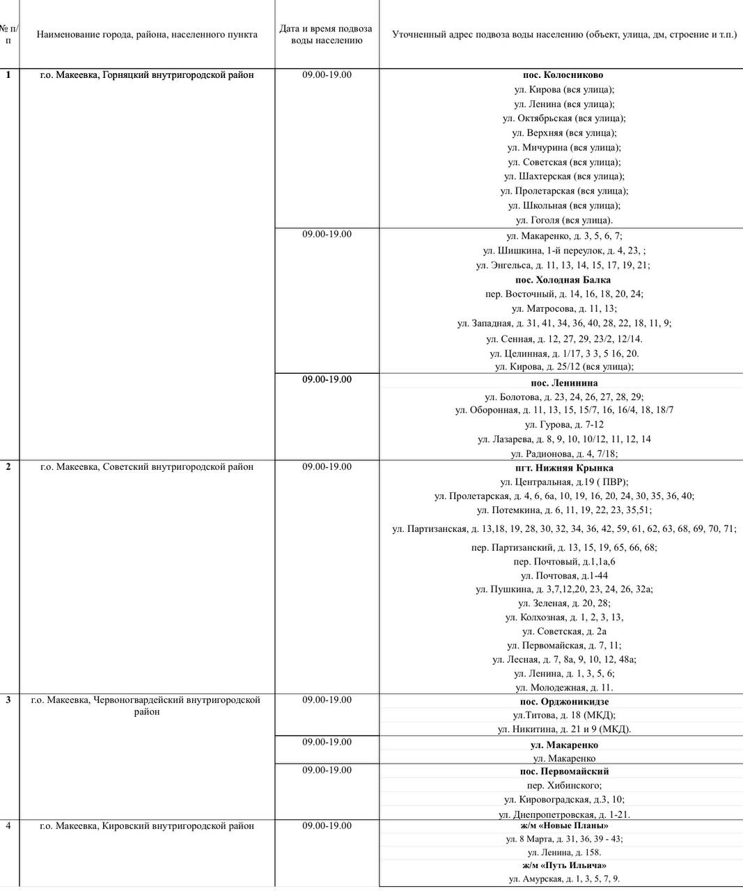 График подвоза воды населению городского округа Макеевка