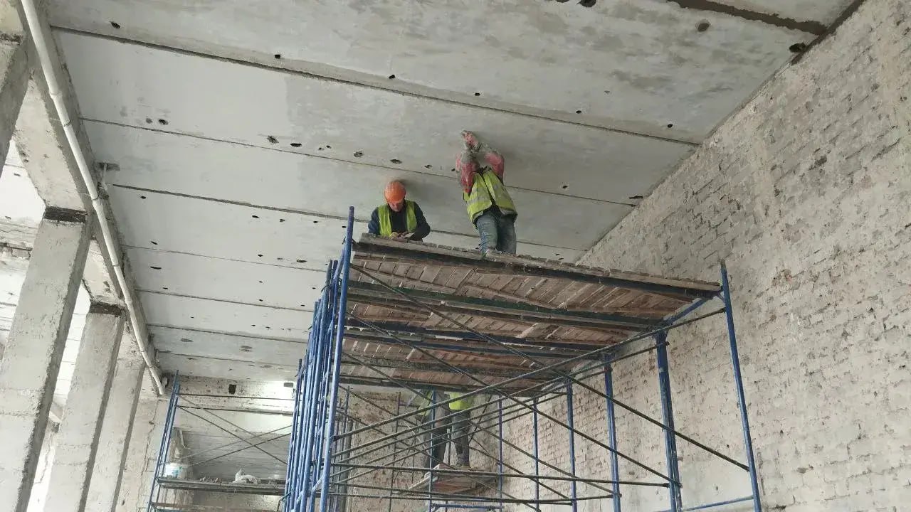 В здании строители города-побратима уже зачищают потолки, грунтуют поверхности и заделывают швы в плитах перекрытия.