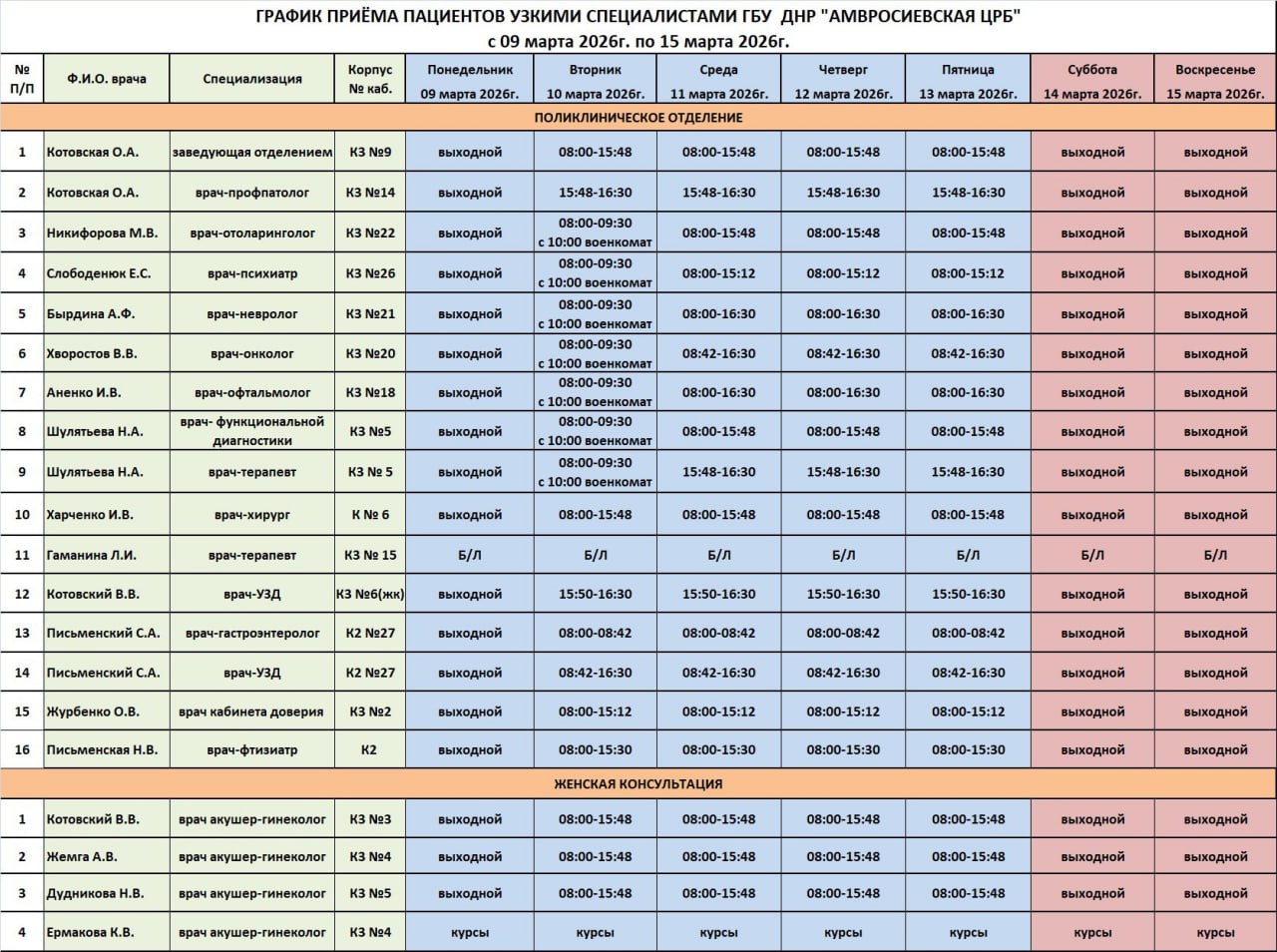 График приема врачей поликлинического отделения ГБУ ДНР "Амвросиевская ЦРБ"