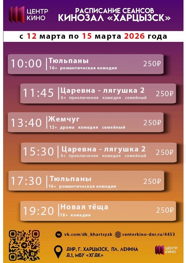 Расписание сеансов в кинотеатрах «Харцызск» и «Трубник» с 12 по 15 марта 2026 года