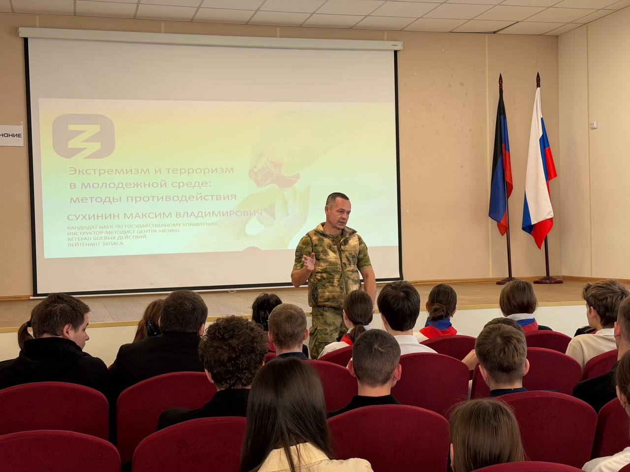 Перед учащимися выступил гость — лектор Российского общества «Знание» Максим Сухинин. За его плечами колоссальный опыт: участие в СВО, работа старшим инструктором-методистом филиала Центра «ВОИН» в ДНР, волонтерская деятельность и звание кандидата наук государственного управления. Максим также является участником кадровой программы «Время Героев» и руководителем филиала «ДОБРОФОНДА» в ДНР.