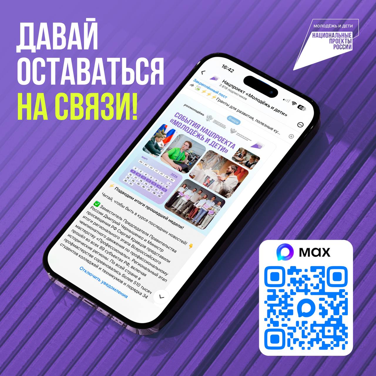 Нацпроект «Молодёжь и дети» есть в МAX!Если хочешь быть в курсе всего самого актуального и интересного для молодёжи и детей, то подписывайся на канал!