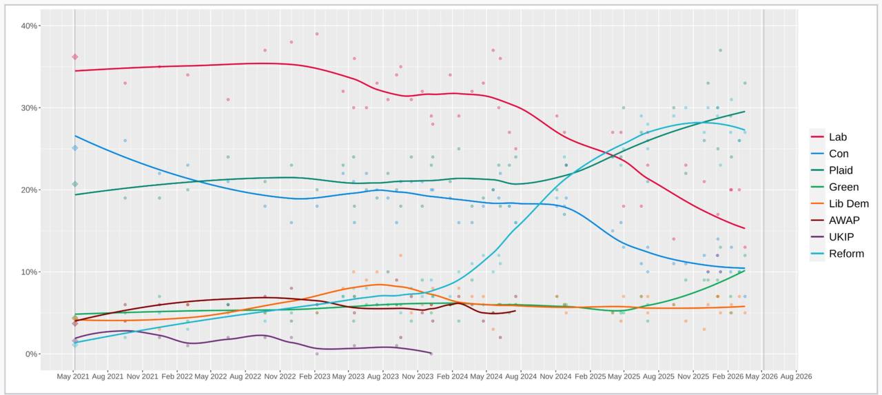 Дело в том, что с за всю историю выборов регионального парламента там всегда неизменно первое место занимали лейбористы. Но сейчас стараниями Стармера и его команды рейтинг правящей партии стремительно летит в пропасть. Plaid пока не может претендовать на самостоятельное формирование большинства, но мейнстрим опасается, что борцы за независимый Уэльс сформируют коалицию с Зелеными, которые также активно набирают рейтинг на критике войны в Иране и позиции Стармера в ней. Если эта коалиция будет сформирована, это будет гремучая смесь для Лондона.