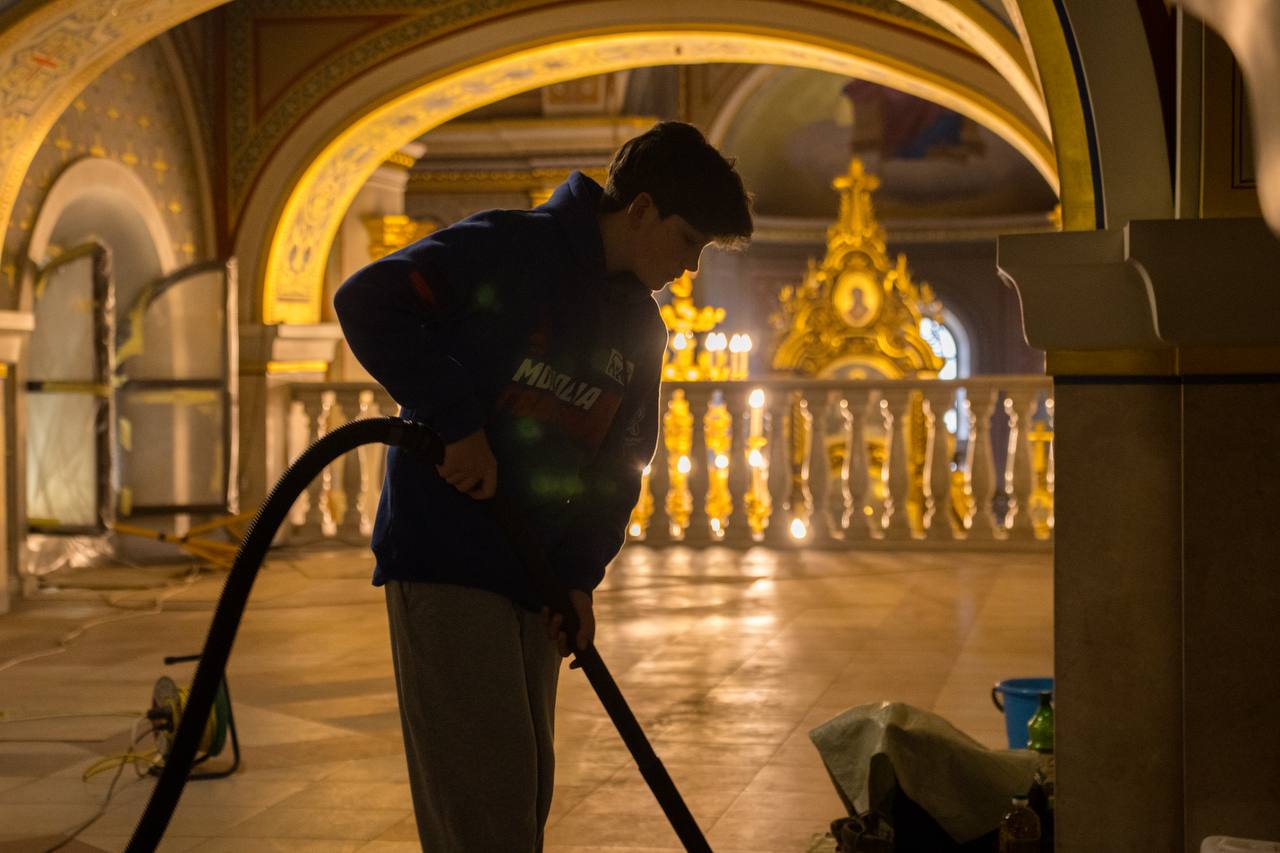 Молодёжь приводила в порядок внутренние помещения собора, включая закрытые залы и служебные зоны, также помыли лестницы, окна и иконы.