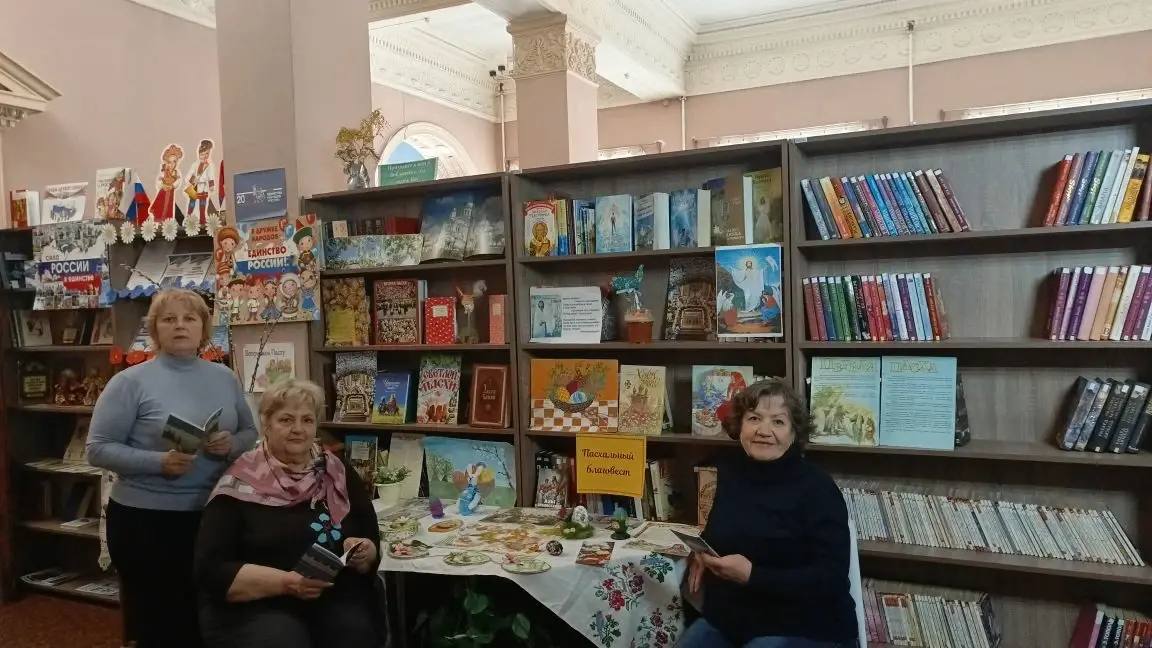 Здесь представлены книги и журналы, посвященные празднику Светлого Христова Воскресения. Особое внимание уделили народному творчеству. Множество пасхальных поделок принесли читатели библиотеки.