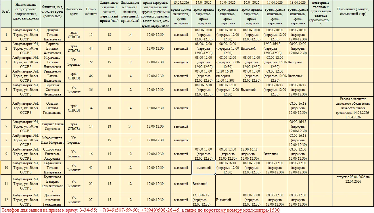 В рамках работы муниципального штаба по вопросам здравоохранения при администрации городского округа Торез, который был создан по поручению Главы ДНР Дениса Пушилина, администрация городского округа Торез информирует о графике приема пациентов врачами ГБУ ДНР "ЦГБ г.Тореза" с 14.04.2026- 18.04.2026