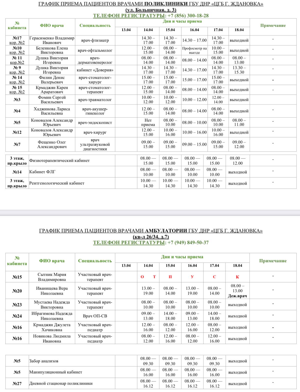 График приема врачами амбулатории и поликлиники ГБУ ДНР «ЦГБ г. Ждановка» с 14.04.2026 по 19.04.2026