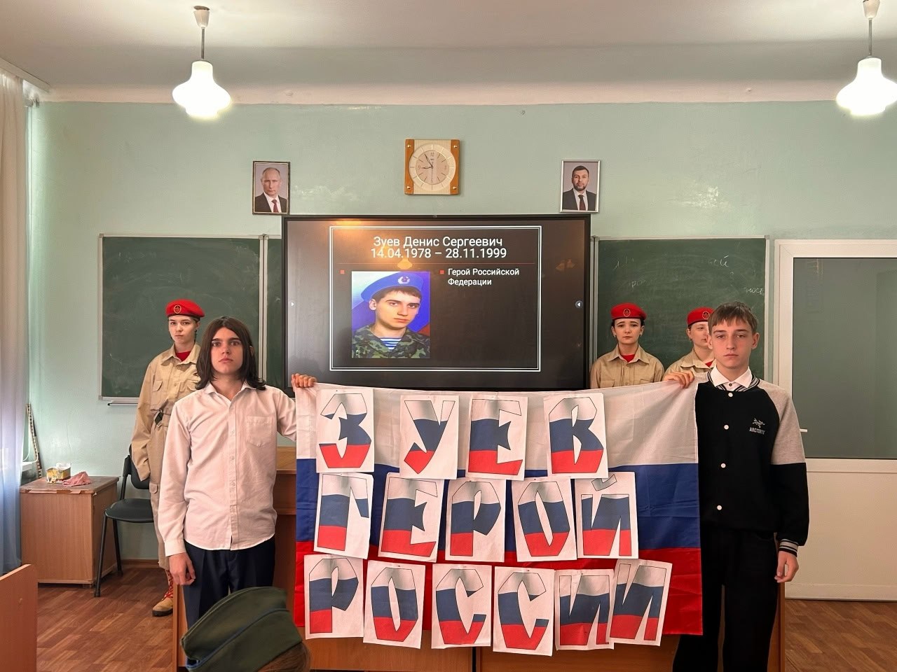 В начале встречи все присутствующие почтили минутой молчания Дениса Зуева. Затем ребята возложили цветы к мемориальной доске, установленной в честь Героя, и посмотрели документальную кинохронику, рассказывающую о его жизни и подвигах.