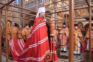 К началу богослужения в собор прибыл митрополит Донецкий и Мариупольский Владимир. Владыка доставил в храм особую святыню - сосуд с Благодатным огнем, который впервые с 2019 года был привезен на Донецкую землю в Пасхальную ночь. Преподав благословение прихожанам, правящий архиерей с благоговением приложился к раке со святыми мощами преподобного схимонаха Илии, после чего возглавил торжественную Божественную литургию.