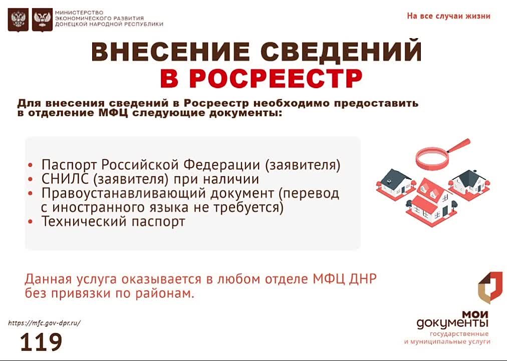 2 Во всех отделениях МФЦ ДНР установлен единый день — четверг. В этот день во всех центрах "Мои документы" оказывается прием документов по услугам Росреестра.