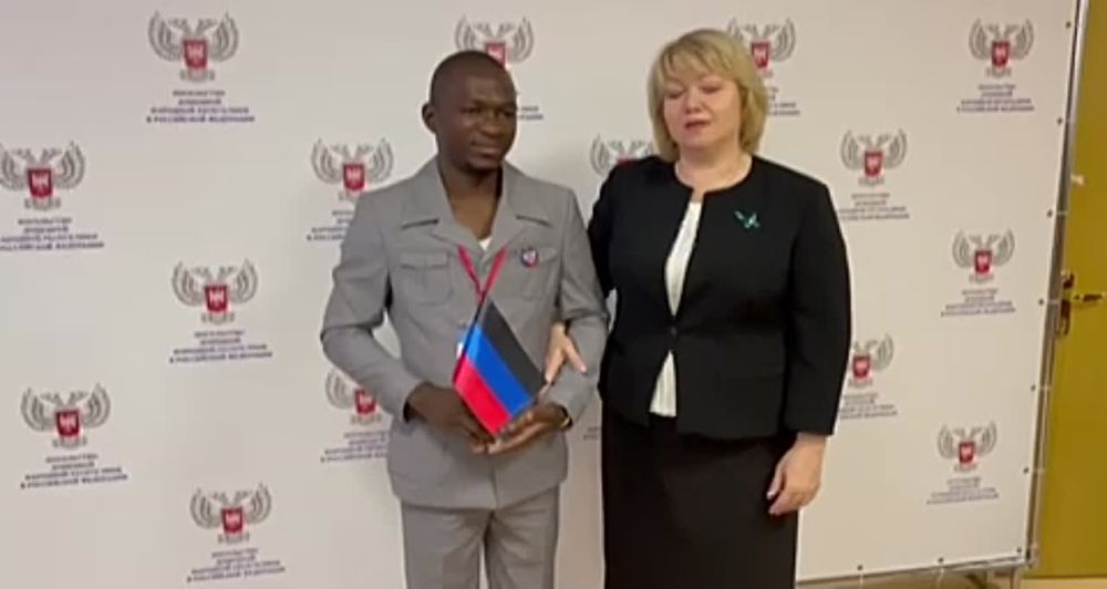 Посол ДНР Ольга Макеева вручает донецкие сувениры наблюдателю из Центральноафриканской республики.