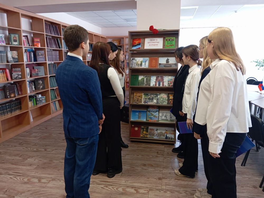 Сотрудник читального зала центральной городской библиотеки для учащейся молодежи ГБОУ «Школа № 3 г.о. Дебальцево» провела акцию «На литературной высоте». Она познакомила ребят с историей становления праздника, рассказала о народном поэте Дагестана Расуле Гамзатове. Присутствующие услышали историю создания стихотворения «Журавли», легенду о белом журавлике, рассказ о японской девочке Садако, ставшей одной из жертв атомного взрыва в Хиросиме. Так же ребята посмотрели презентацию «Вечные солдаты», подготовленную библиографом Нисенбаум С.В. отрывок из фильма «Летят журавли», который в Каннах, получил главный приз - Золотую пальмовую ветвь, прослушали стихотворение Р. Гамзатова «Колокол Хиросимы» и познакомились с тематической выставкой «Летят в бессмертье журавли».
