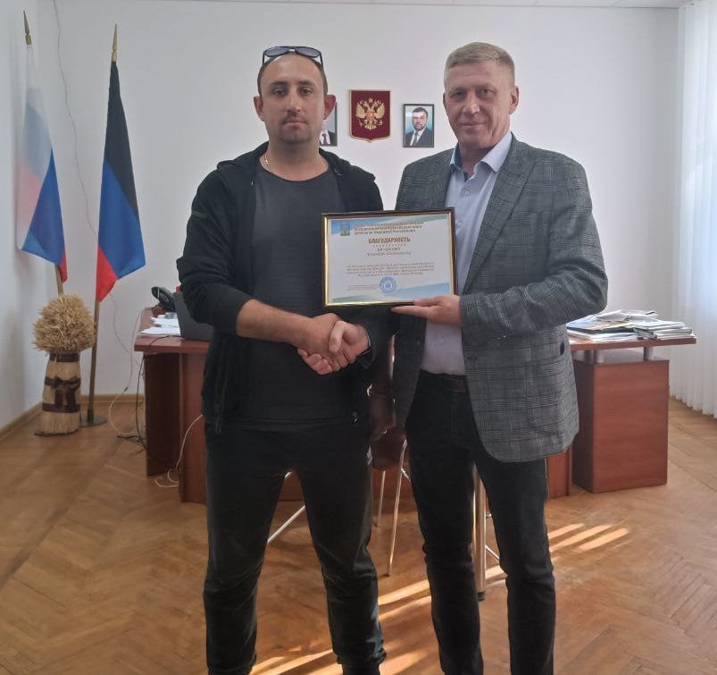 За большой личный вклад в реконструкцию братской могилы воинов Южного фронта, памятника погибшим односельчанам в п. Володарское и в честь 80-летия Победы вручил благодарность Кузьмину Никите Анатольевичу и Арчакову Алексею Сергеевичу, которые проявили свое профессиональное мастерство во время реконструкции памятника.